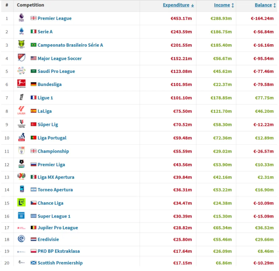 Ovi podaci preuzeti su sa poznatog sajta Transfermarkt, koji je rangirao 20 najjačih fudbalskih liga u svetu po balansu u zimskom prelaznom roku, uz napomenu da su neke pijace otvorene još otvorene. Dakle, računata je razlika uloženog i prihodovanog novca svih klubova u ligi.
