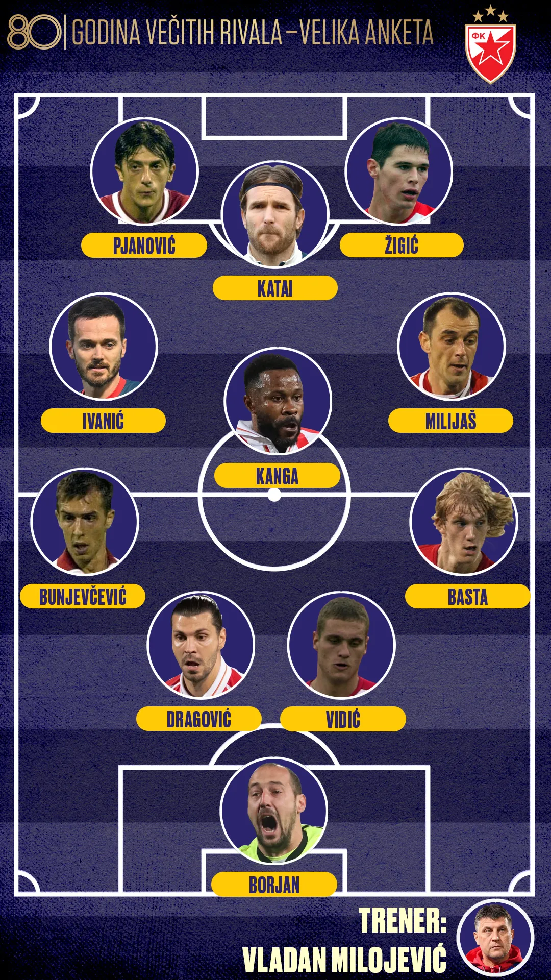 IDEALNIH 11 CRVENE ZVEZDE U 21. VEKU U IZBORU PUBLIKE (4-3-3): Milan Borjan (78,19%) - Dušan Basta (60,35%), Nemanja Vidić (93,16), Aleksandar Dragović (65,70%), Goran Bunjevčević (32,12%) - Nenad Milijaš (60,26), Gelor Kanga (33,01%), Mirko Ivanić (65,23%) - Mihajlo Pjanović (33,19%), Aleksandar Katai (63,22%), Nikola Žigić (65,88%). Trener: Vladan Milojević (57.71%)