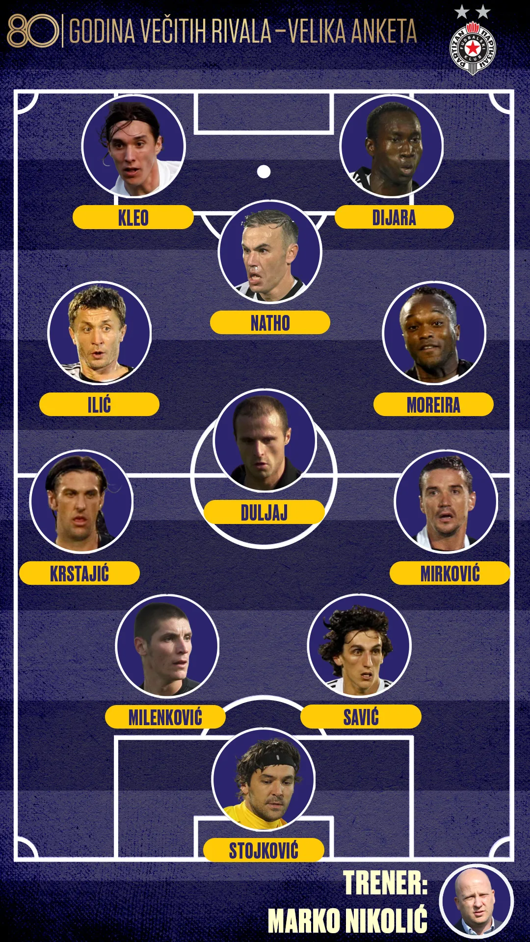 IDEALNIH 11 PARTIZANA U 21. VEKU U IZBORU PUBLIKE (4-4-2): Vladimir Stojković (50,68%) - Zoran Mirković (49,23%), Nikola Milenković (35,27%), Stefan Savić (40,10%), Mladen Krstajić (65,53%) - Igor Duljaj (38,63%) - Almami Moreira (54,35%), Bibars Natho (34,63), Saša Ilić (88,14%) - Kleverson Kordova Kleo (45,62%), Lamin Dijara (48,10%). Trener: Marko Nikolić (35.08%).