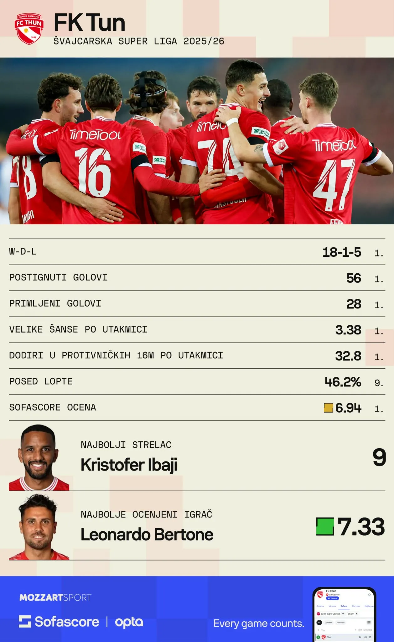 Od 24 dosadašnja kola Superlige, Tun je 19 proveo na liderkoj poziciji. Otkako je početkom novembra pobedio Sankt Galen u gostima nije silazio sa prvog mesta. I postepeno je uvećavao bodovnu prednost. Tun danas ima 13 bodova prednosti u odnosu na Sankt Galen i Lugano. Deluje da ništa ne može da ga zaustavi u šampionskoj misiji.