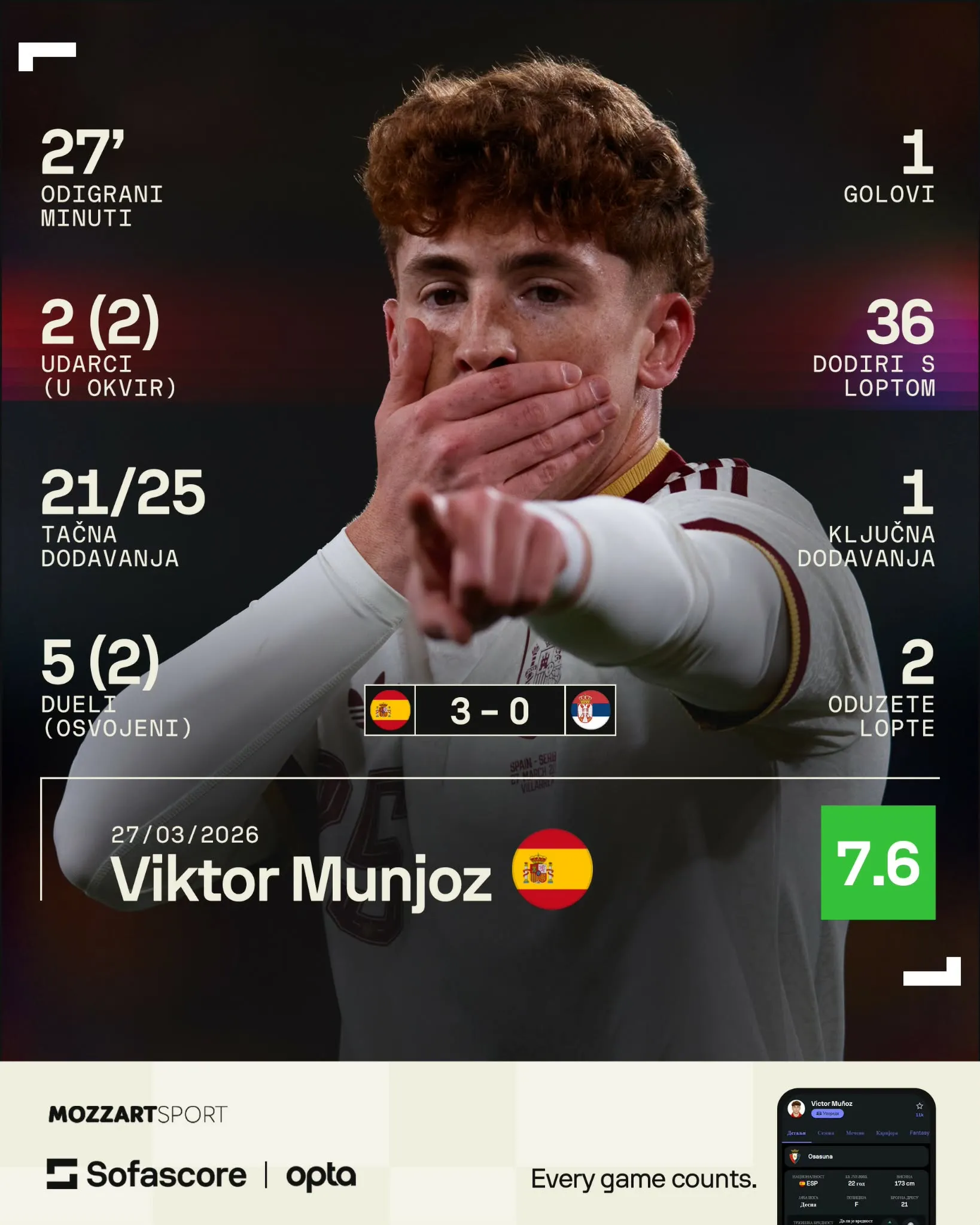 Veći deo meča su Aleksa Terzić i Filip Kostić duplirali Lamina Jamala na toj strani terena, izginuli čuvajući ga i taman kada su pomislili da izlaskom Barsinog asa mogu da odahnu... Zadesila ih je riđokosa napast Munjoz. Napadač Osasune je uneo živost u igru pomalo uspavane Španije i počeo da stavlja odbranu Orlova na muke. Čim je ušao, iznudio je faul, probao ‘jedan na jedan’... Nakon desetak minuta na terenu je sjanom završnicom krunisao još lepšu asistenciju Ferana Toresa koji je takođe ušao sa klupe.