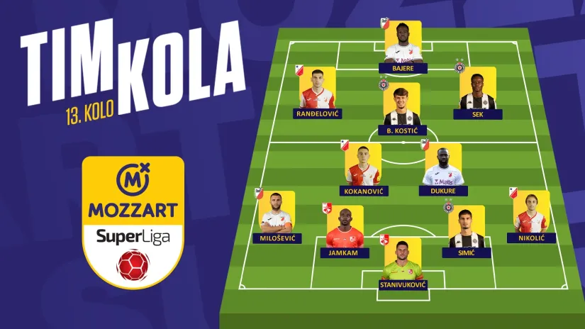 Idealni tim 13. Kola Mozzart Bet Superlige posložen je u formaciji 4-2-3-1: Stanivuković (Radnički Niš) – Nikolić (Vojvodina), Simić (Partizan), Jamkam (Radnički Niš), Milošević (Javor) – Kokanović (Vojvodina), Dukure (Javor) – Sek (Partizan), B. Kostić (Partizan), Ranđelović (Vojvodina) – Bajere (Javor).