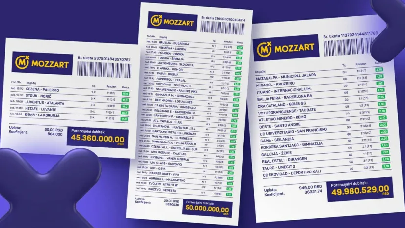 Još je zanimljiviji tiket gde je kladilac Mozzarta pogodio pet prelaza i to onih koje je možda i najteže uhvatiti posle 1-2 i 2-1 gde su najveće kvote, a to su 1-X ili 2-X i sa „samo“ pet parova sa uloženih 50 dinara stigao skoro do maksimale – 45.360.000.