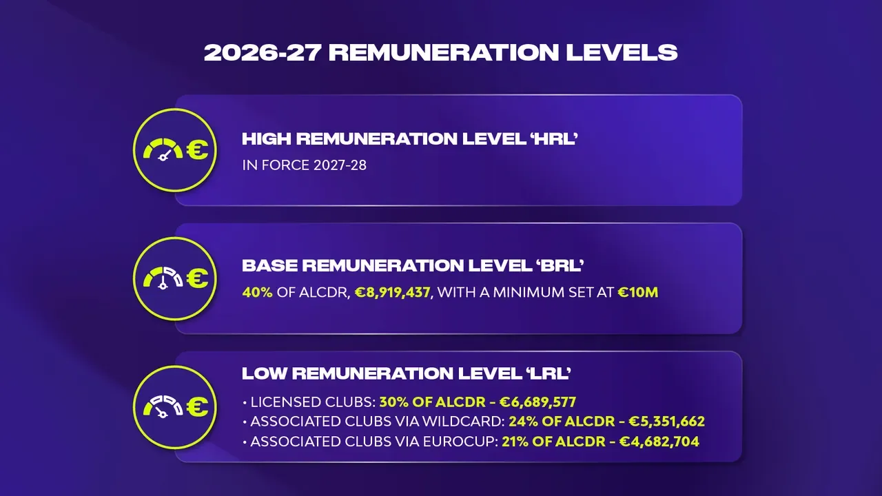 Za sezonu 2026/27, ALCDR iznosi 22.298.591 evra, što znači da se svi proračuni plata zasnivaju na ovom iznosu. Prihodi koji ulaze u ovaj parametar uključuju prodaju ulaznica, komercijalna prava, marketinške ugovore i druge izvore prihoda vezane za takmičenje. Prošle godine je ALCDR iznosio 19.489.944 evra.