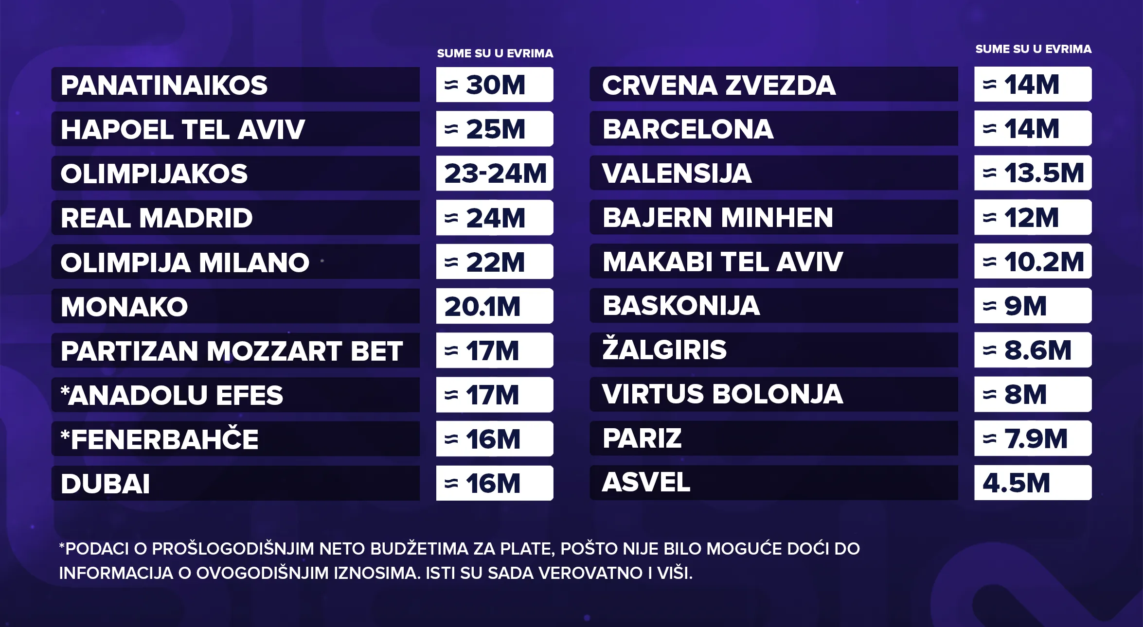 Kada se podvuče crta, Partizan Mozzart Bet gravitira ka gornjem domu evropske košarkaške elite po iznosima namenjenim za plate, uz još jednu ogradu zbog iznosa budžeta turskih velikana što bi istu moglo da promeni, dok je Crvena zvezda na zlatnoj sredini.