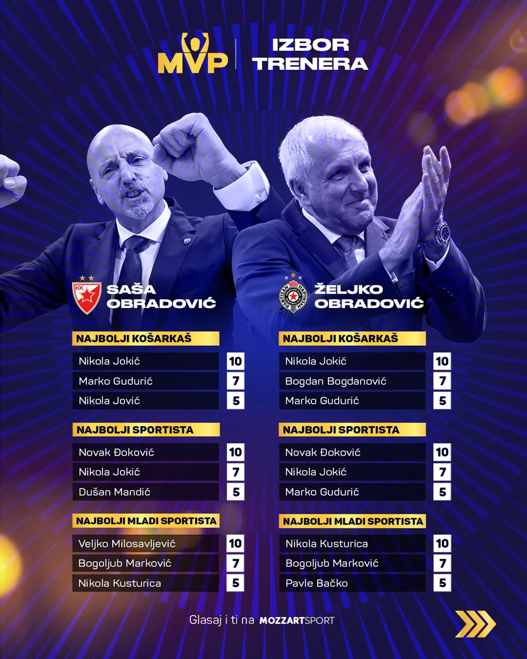 Pod broj jedan: Nikola Jokić je bio najbolji košarkaš Srbije ove godine i tu niko nema dilemu. I Bogdan Bogdanović je po većini drugi na toj listi, mada ga je Saša Obradović izostavio sa spiska, jer je sa sedam bodova nagradio Marka Gudurića za osvojenu Evroligu, dok je pet dao Nikoli Joviću. Mladog Jovića je sa pet bodova pohvalio i Partizanov kapiten Vanja Marinković, dok je Ognjen Dobrić glasao za Gudurića.