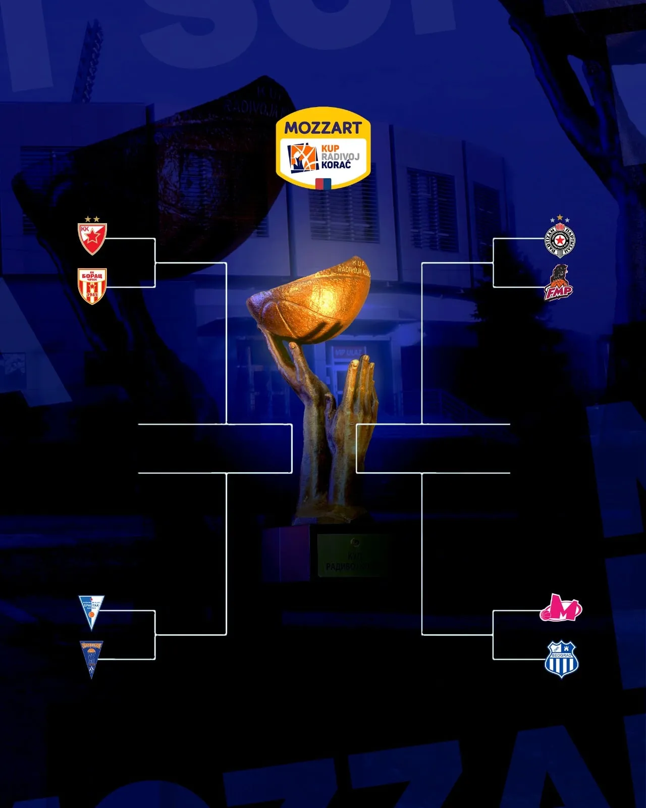 U A delu ili levoj strani kostura nalaze se Crvena zvezda, Spartak, Borac Mozzart i Zlatibor Mozzart. Već na startu će biti mečeva timova iz ABA lige, pa je tako odlučeno da Crvena zvezda u četvrtfinalu odmeri snage sa Borac Mozzartom, a Spartak sa Zlatibor Mozzartom.